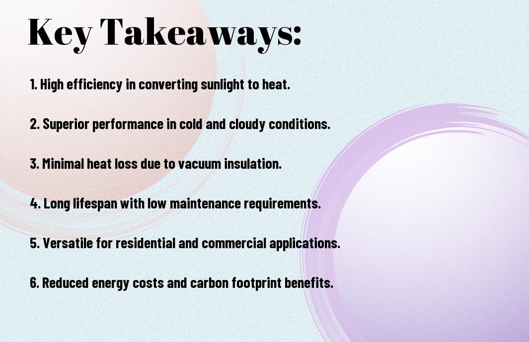 Most homeowners and businesses seeking sustainable energy solutions are turning to solar water heating systems. In this informative post, you will discover the numerous advantages of using evacuated tube collectors, which are designed to maximize efficiency and performance. By harnessing the power of the sun more effectively than traditional flat plate systems, these advanced collectors can significantly reduce your energy costs, enhance your hot water supply, and lower your carbon footprint. Join us as we probe deeper into how evacuated tube collectors can transform your approach to solar energy.